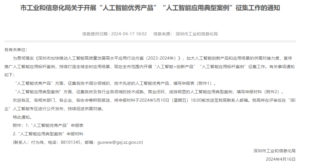 市工业和信息化局关于开展“人工智能优秀产品”“人工智能应用典型案例”征集工作的通知发布日期:2024-04-17 浏览次数:29各有关单位: 为贯彻落实《深圳市加快推动人工智能高质量发展高水平应用行动方案(2023-2024年)》,加大人工智能创新产品和应用场景的供需对接...